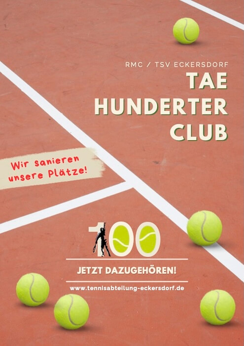 Der 100er-Club steht symbolisch für alle Freunde und Förderer der Tennisabteilung Eckersdorf, die den Verein bei der Bedienung von Darlehensleistungen und zukünftigen Investitionen unterstützen möchten.